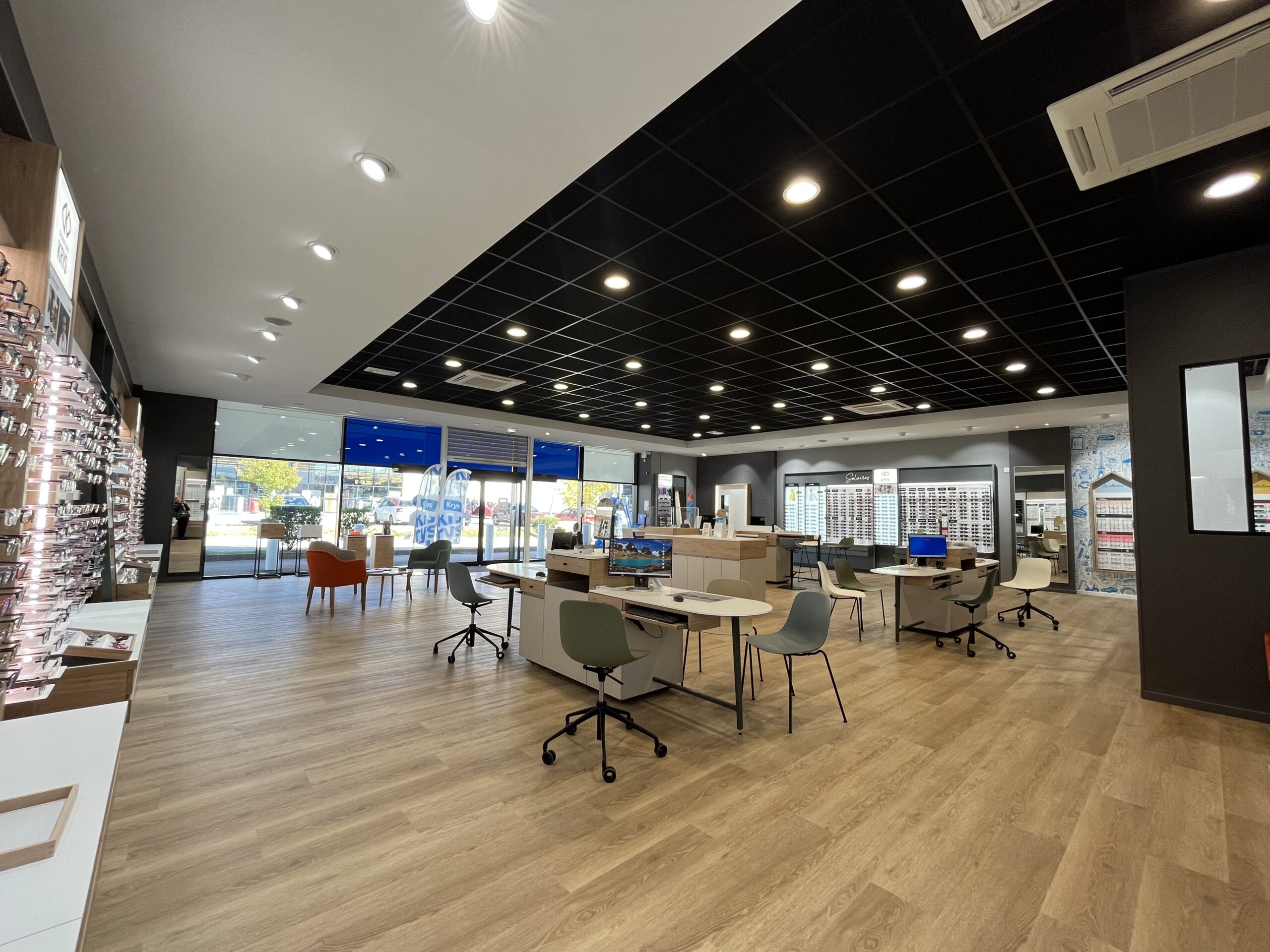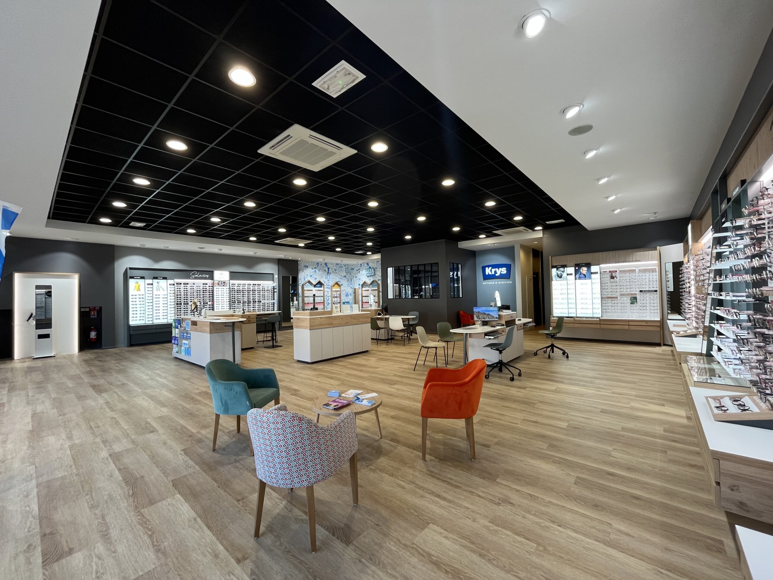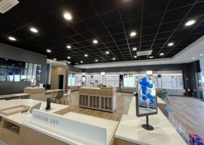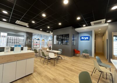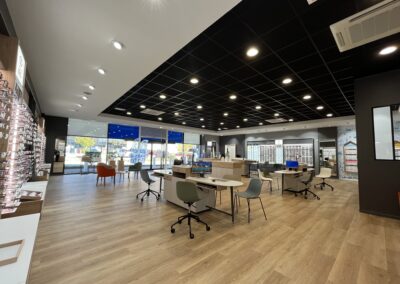 Le projet avait pour objectif d’aménager un local commercial de 287 m2, comprenant la surface de vente, l’espace d’attente, la salle d’examen de vue, la salle d’audition, l’atelier et le back office. L’agencement a été réalisé conformément à la charte nationale KRYS, tout en s’adaptant aux contraintes spécifiques du site.