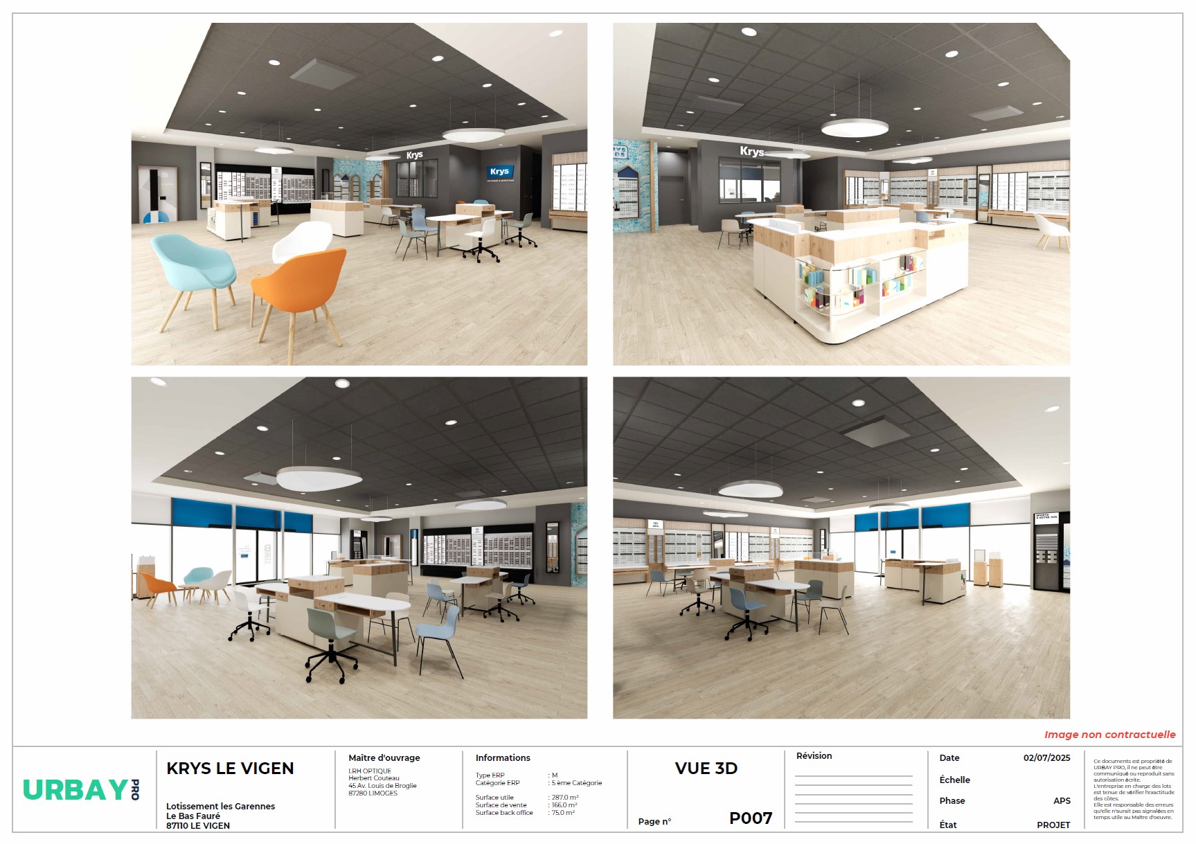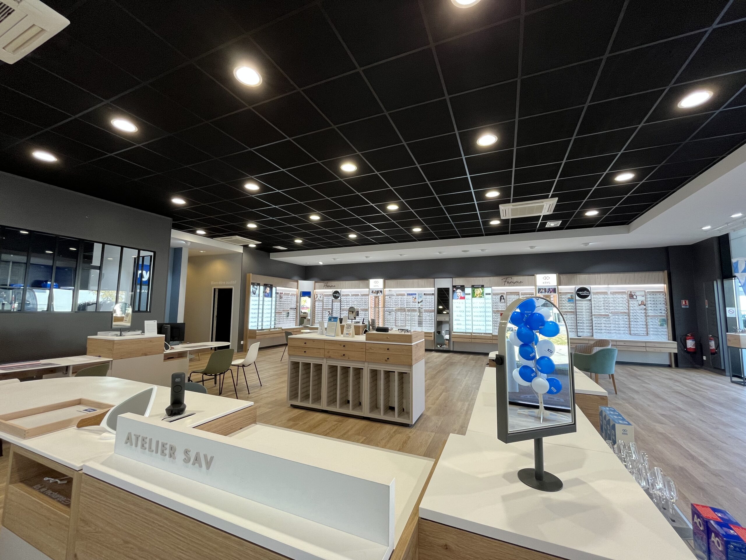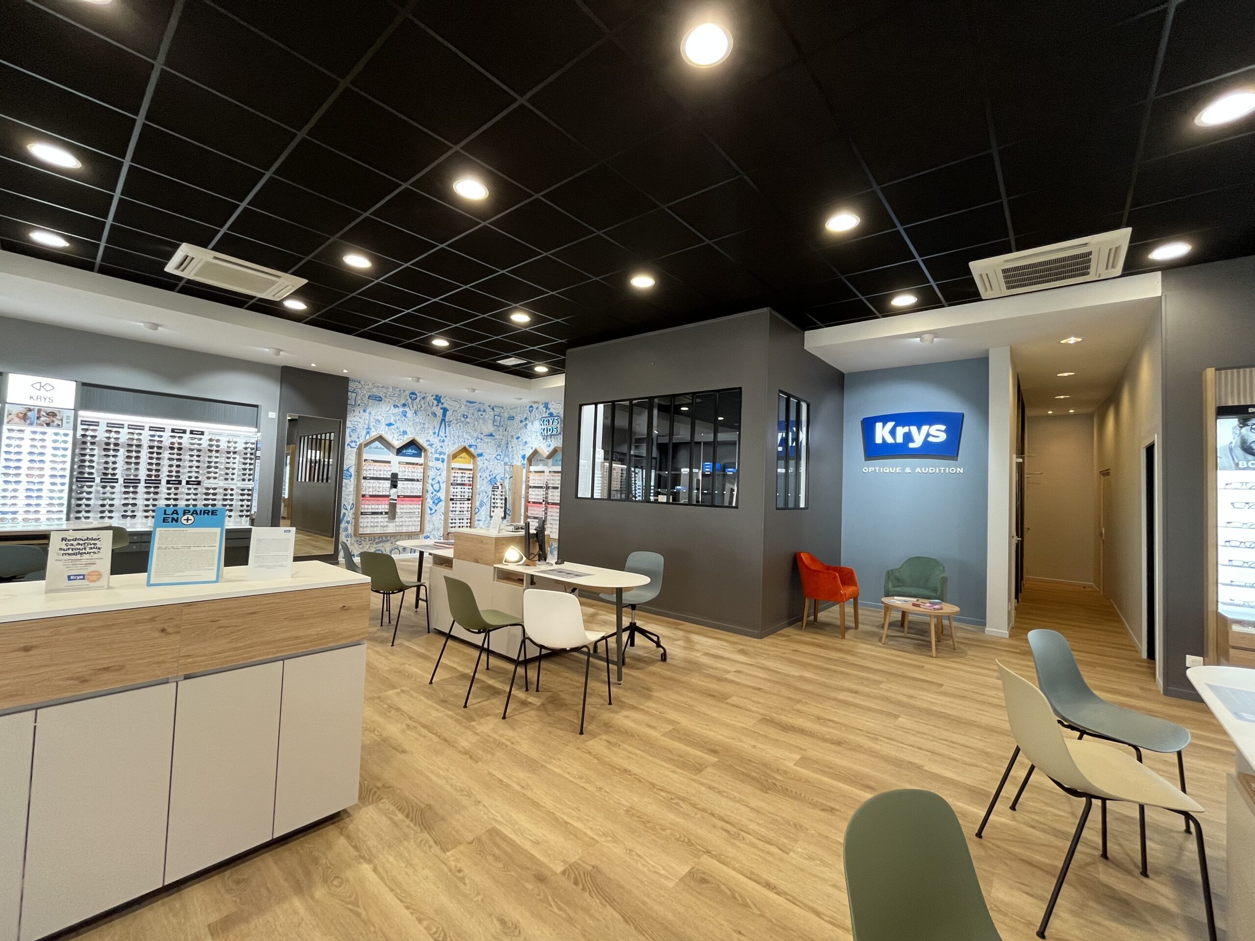 Le projet avait pour objectif d’aménager un local commercial de 287 m2, comprenant la surface de vente, l’espace d’attente, la salle d’examen de vue, la salle d’audition, l’atelier et le back office. L’agencement a été réalisé conformément à la charte nationale KRYS, tout en s’adaptant aux contraintes spécifiques du site.